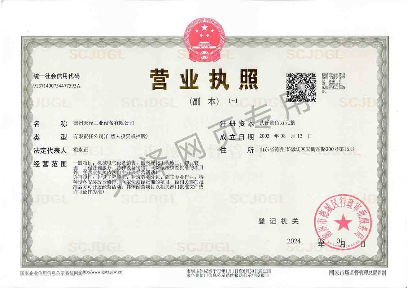 德州天澤工業(yè)設備有限公司成立于2003年(前身為德州天元集團天明工業(yè)設備安裝公司),經(jīng)過20多年的發(fā)展,現(xiàn)成長為擁有職工600余人,各類專業(yè)技術人員近300余人,年生產(chǎn)能力兩億元以上,以建筑機電安裝工程、消防設施安裝工程施工為主,集建筑工程施工、市政工程施工、建筑智能化工程施工、園林綠化工程施工、工程管理服務、物業(yè)管理、電氣機械設備銷售等多元化經(jīng)營于一體的綜合型企業(yè)。2005年,企業(yè)按照國際標準建立的質量管理體系,通過了ISO質量管理體系認證、環(huán)境管理體系認證、職業(yè)健康安全管理體系認證。施工工程遍布山東、河北、四川、江蘇等地,最具代表性的工程有:山東省德州市百腦匯資訊廣場機電安裝工程、德州經(jīng)濟開發(fā)區(qū)天元大廈機電安裝工程、陵城區(qū)人民醫(yī)院機電安裝工程、德州金魯班大廈機電安裝工程、河北故城金辰小區(qū)機電安裝工程、北川地震災后援建工程等。多年來,公司始終堅持“以人為本,建精品工程,創(chuàng)行業(yè)品牌”的經(jīng)營理念,先后榮獲省(市)級泰山杯、天府杯、魯安杯等獎項,申報各種功法、多項專利。